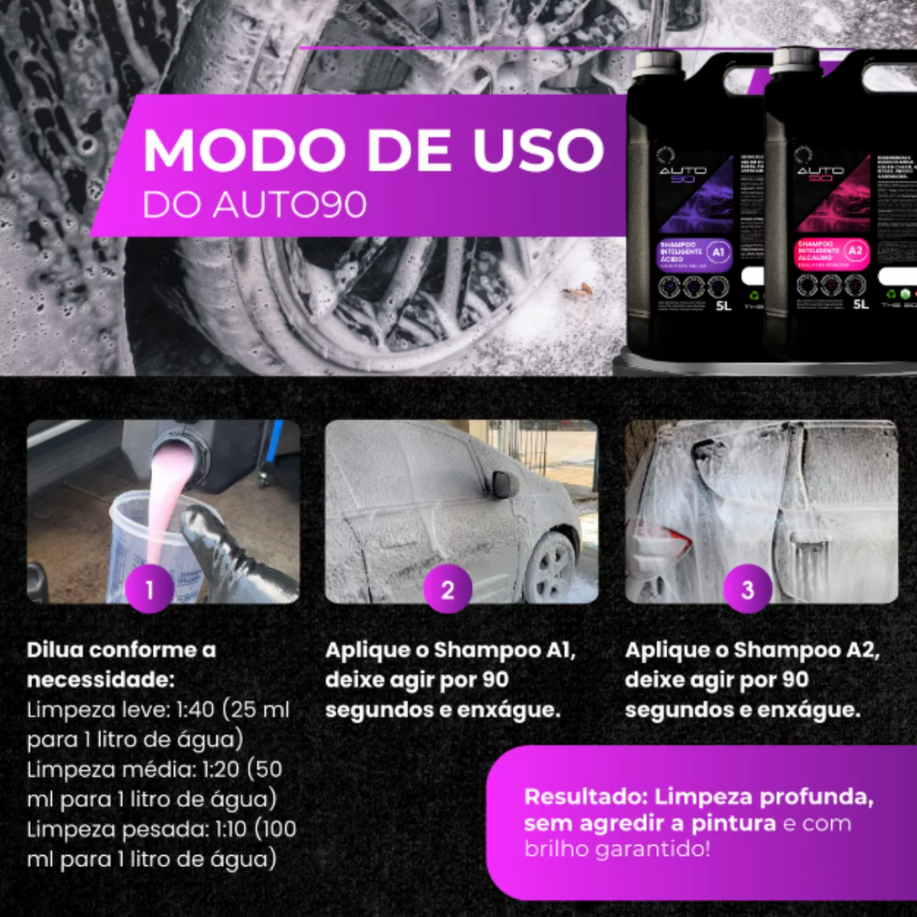 Auto90 10L: até 120–200 lavagens (varia por diluição, tamanho do veículo e método).