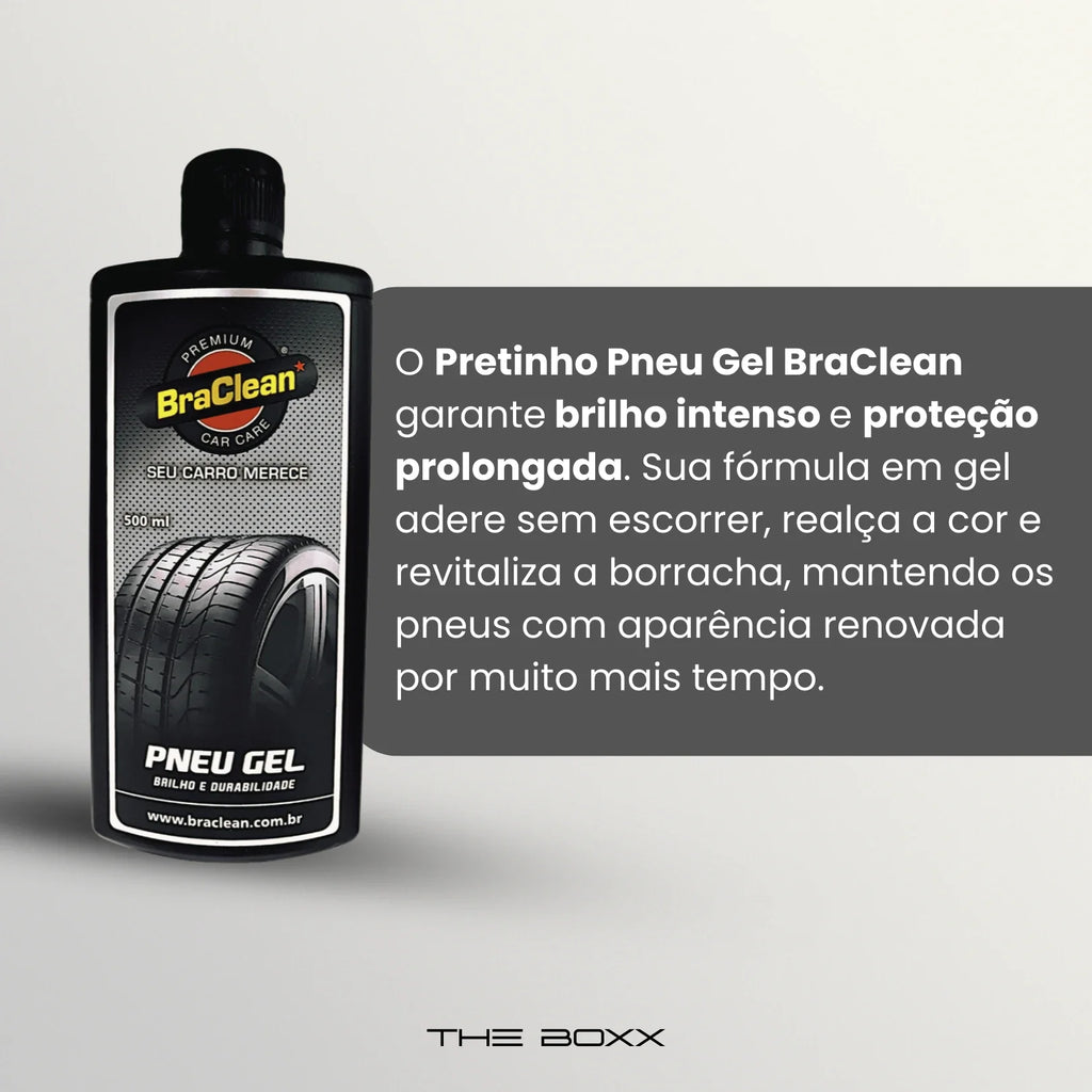 Volume profissional para quem lava com frequência: o Auto90 10L dissolve a sujeira pesada em ~90 segundos, e o Pretinho em Gel Braclean garante pneus pretos, uniformes e sem escorrer.