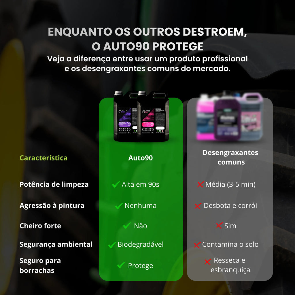O Kit Auto90 Agro 10L é a versão perfeita para quem quer testar o poder do Auto90 antes de investir no formato profissional. Desenvolvido especialmente para o campo, ele foi criado para quem precisa lavar tratores, colheitadeiras, pulverizadores e máquinas pesadas com rapidez, segurança e alto rendimento.